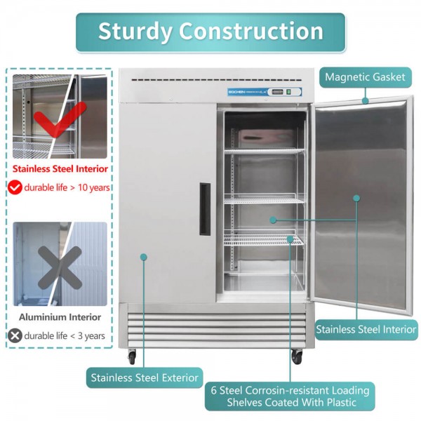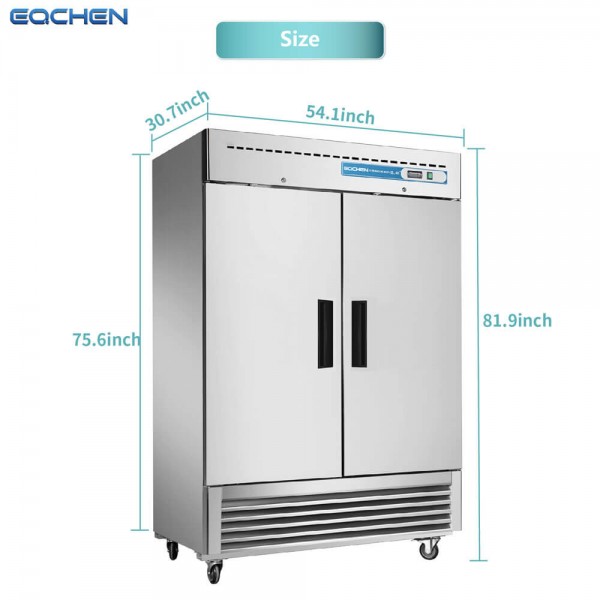 Eqchen 54" W Commercial Refrigerator 2 door 2 Section Stainless Steel Reach in Solid door Upright Fan Cooling 49 Cu.ft Cooler for Restuarant, Bar, Shop, etc