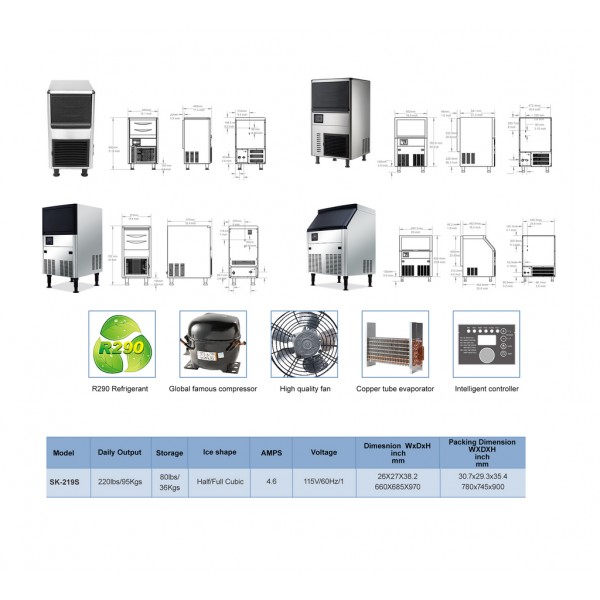 Reliable refrigeration system ensure high speed and stable refrigerating process, reasonable ice making method ensure high quality and smooth ice output. The cube ice depth can be adjusted from 19mm to 25mm.