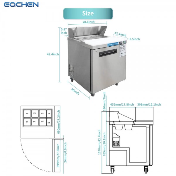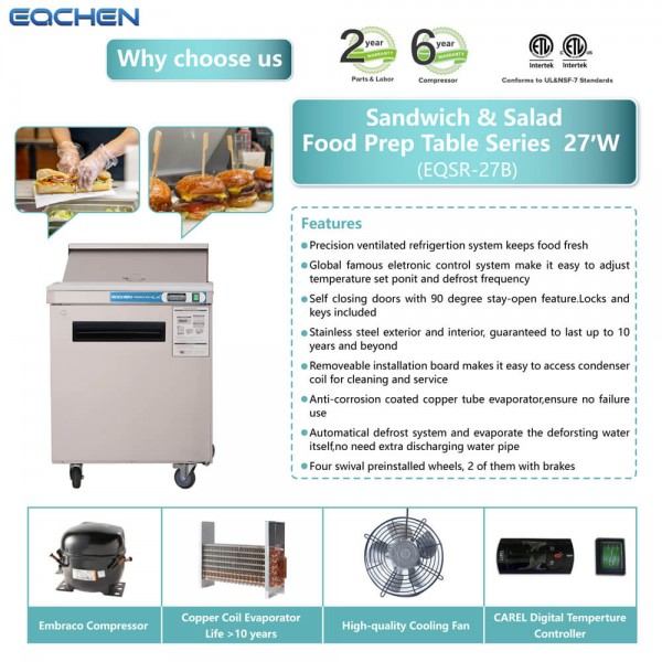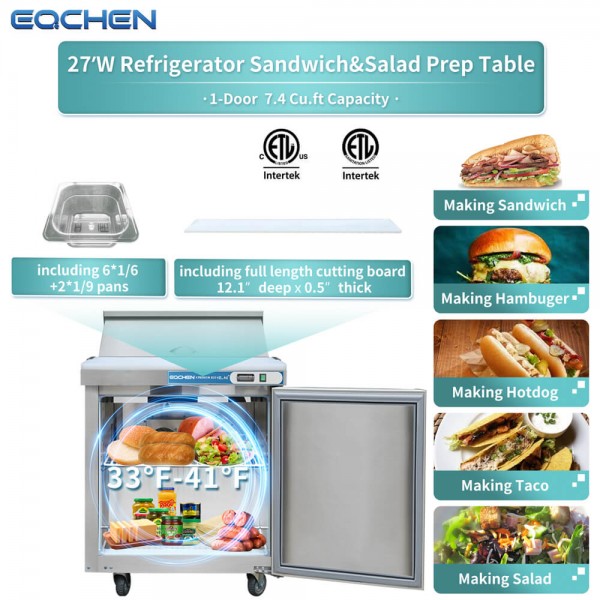 Sandwich Prep Table Refrigerator, EQCHEN 27" 1 Door Salad Sandwich Prep Table. EQCHEN Sandwich Prep Table Refrigerator 27 Inch Refrigerated Sandwich & Salad Station Fridge Cooler with 8 Pans – the ultimate solution for your sandwich and salad preparation needs. Crafted with precision and designed for efficiency, this Sandwich Prep Table Refrigerator offers a seamless blend of performance and convenience.