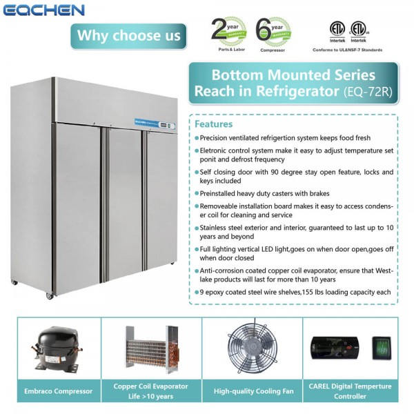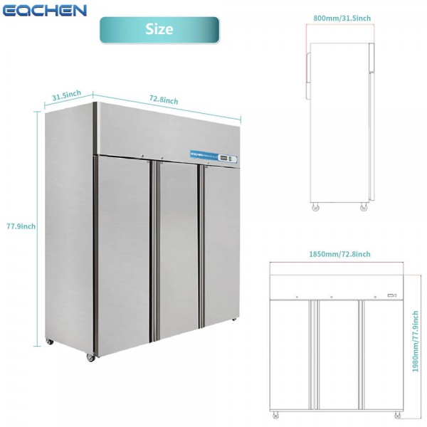 The professional design of the refrigerator includes three solid doors, each capable of supporting a loading capacity of 90 lbs per shelf, offering a total storage room of 54 cubic feet. The addition of 4" casters ensures convenient mobility whenever required. What sets EQCHEN apart is its commitment to customer satisfaction. The product is backed by a substantial 6-year warranty on the compressor, a 2-year warranty covering all parts and labor, and manual door-to-door service. Professional customer service personnel and engineers are available to address inquiries online, by phone, or through email. In summary, the EQCHEN EQ-72R is not merely a commercial reach-in fridge; it's a comprehensive refrigeration solution that combines reliability, high-quality construction, and extensive warranty coverage. Elevate your refrigeration experience with EQCHEN – contact us today for unmatched performance and support. EQCHEN EQ-72R 3 Door Commercial Refrigerator, a robust 72-inch commercial upright reach-in fridge designed for optimal storage in restaurants, bars, shops, and various commercial settings. Branded under EQCHEN, this refrigerator is built with a focus on durability and quality, featuring a stainless steel interior and exterior that ensures longevity and easy maintenance. This commercial refrigerator boasts a powerful Cubigel compressor, a Carel controller, and a fan cooling system, eliminating the need for an extra tube for condensing water due to its automatic defrost capability.