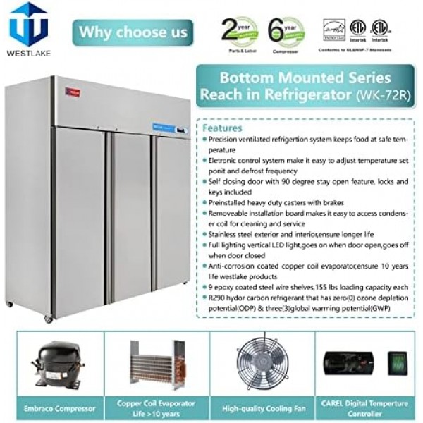 WESTLAKE 72" W Commercial Refrigerator 3 door 3 Section Stainless Steel Reach in Solid door Upright Fan Cooling 54 Cu.ft Cooler for Restuarant, Bar, Shop, etc