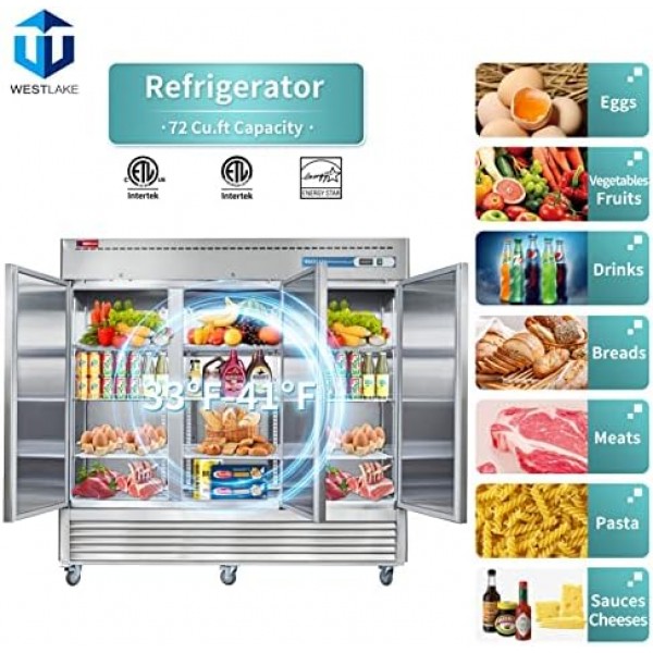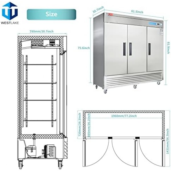 WESTLAKE 82" W Commercial Refrigerator 3 door 3 Section Stainless Steel Reach in Solid door Upright Fan Cooling 72 Cu.ft Cooler for Restuarant, Bar, Shop, etc