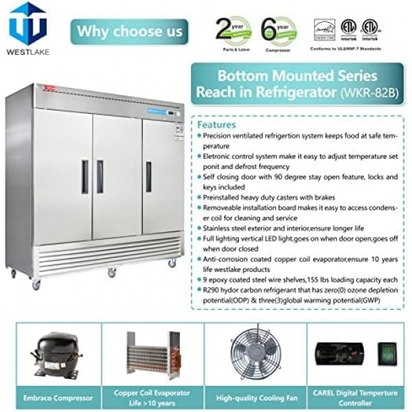 3 Door Commercial Refrigerator, WESTLAKE WKR-82B 82" W Reach in Fridge 72 Cu.ft Upright Cooler for Restaurant, Bar, Shop, etc