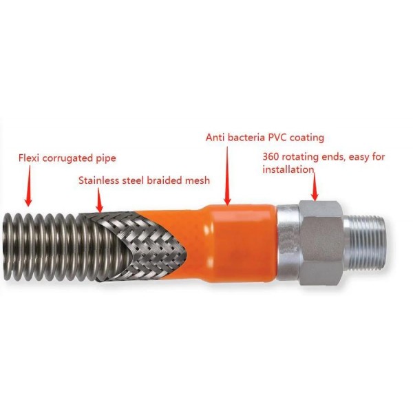 - Flexible stainless steel corrugated tube with stainless steel braid for stretch prevention