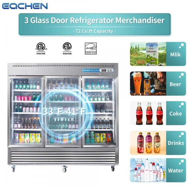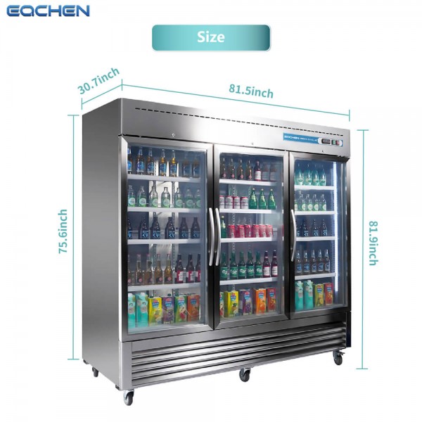 3 Glass Door Commercial Refrigerator, Eqchen EQR-82BG 82" W Reach in Fridge 72 Cu.ft Upright Cooler for Restaurant, Bar, Shop, etc