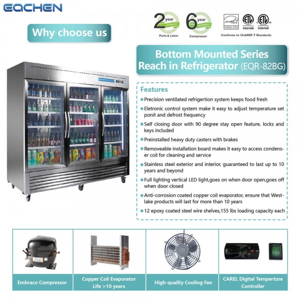 EQCHEN EQR-82BG, a state-of-the-art 3 Glass Door Commercial Refrigerator designed to meet the diverse needs of commercial establishments such as restaurants, bars, and shops. With a capacious 72 Cu.ft Stainless Steel Reach-in Upright Merchandiser, this premium appliance stands at the forefront of commercial refrigeration. The product boasts a sleek design and robust construction, reflecting the quality synonymous with the EQCHEN brand. Its impressive features include a powerful Embraco compressor, Carel controller, and Fan cooling system, ensuring optimal refrigeration performance. The digital temperature control allows for efficient refrigeration, maintaining cooler temperatures between 33℉ and 40℉. Professionally designed with three solid doors, twelve shelves, and a loading capacity of 155lbs per shelf, the EQR-82BG offers a generous 72 cubic feet of storage space. The unit is equipped with 4" casters, providing convenient mobility as needed. ETL certifications for safety, sanitation, and Energy DOE compliance make it suitable for restaurant open authorization. Enjoy a comprehensive warranty package, including a 6-year warranty on the compressor, a 2-year warranty on all parts and labor, and manual door-to-door service. The stainless steel interior and exterior, featuring an anti-fingerprint design, enhance both durability and aesthetics. Note that curbside delivery is available for both commercial and residential addresses, ensuring a seamless experience.