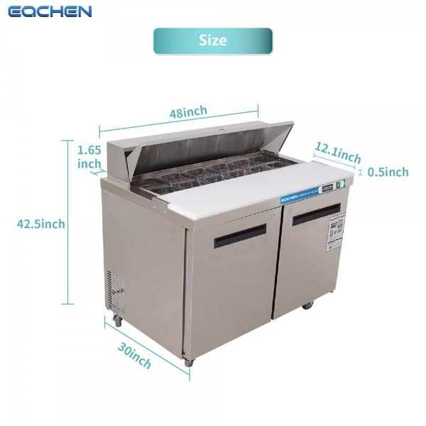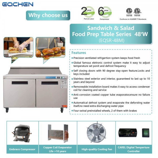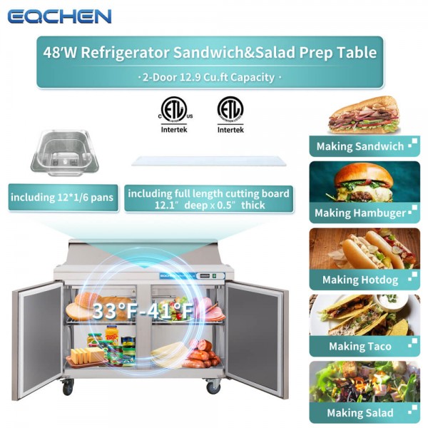 Sandwich Prep Table Refrigerator, EQCHEN 48" 2 Door Commercial Salad Sandwich Food Prep Table Cooler. EQCHEN Sandwich Prep Table Refrigerator 48 Inch Refrigerated Sandwich & Salad Station Fridge Cooler with 12 Pans – a top-tier solution for enhancing your culinary operations. This refrigerated sandwich and salad station redefine efficiency and convenience in food preparation. Crafted with a stainless steel interior and exterior, this 48-inch sandwich prep table ensures durability and a sleek aesthetic. The EQCHEN brand stands by the quality of its product, providing a 6-year warranty on the compressor and a 2-year warranty on all parts and labor, coupled with manual door-to-door service.