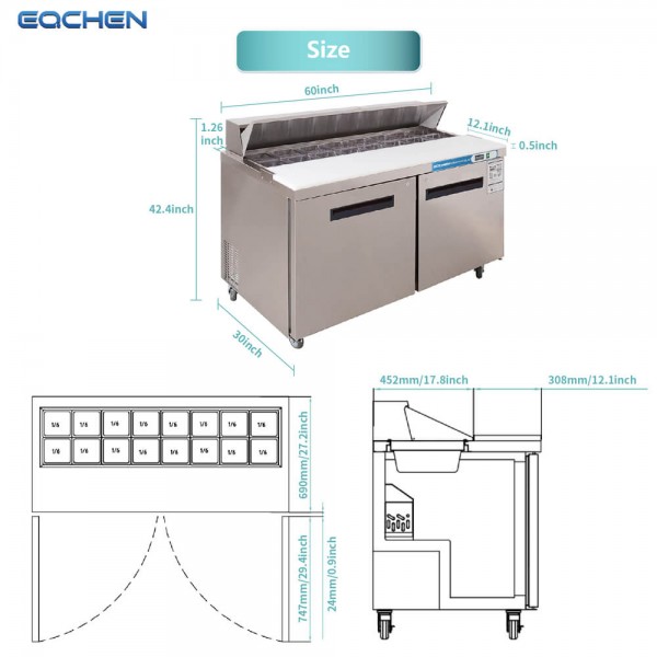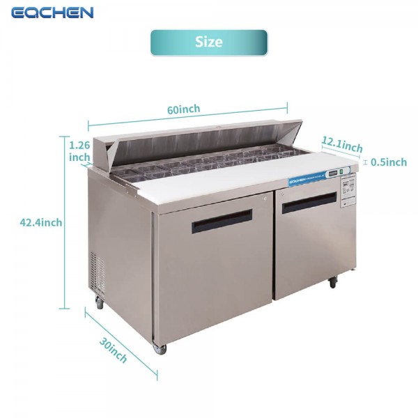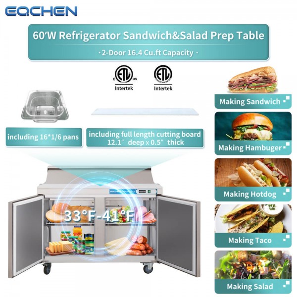 The EQCHEN 60" 2 Door Commercial Salad Sandwich Prep Table is a reliable and efficient refrigeration solution for businesses in the food industry. It features a stainless steel interior and exterior with an anti-fingerprint function, ensuring durability and a clean appearance. The product is backed by a 6-year warranty on the compressor, a 2-year warranty on all parts and labor, and offers manual door-to-door service. The specific model, EQSR-60B, has dimensions of 60x30x42.5 inches, a 1/2 HP compressor, and a capacity of 12.9 Cu.ft. The package dimensions are 62.2 x 45.7 x 32.3 inches, and it includes features such as a swing door, digital LED temperature control, and a US standard plug. In summary, the EQCHEN 60" 2 Door Commercial Salad Sandwich Prep Table combines efficiency, durability, and convenient features to meet the refrigeration needs of businesses in the food industry.