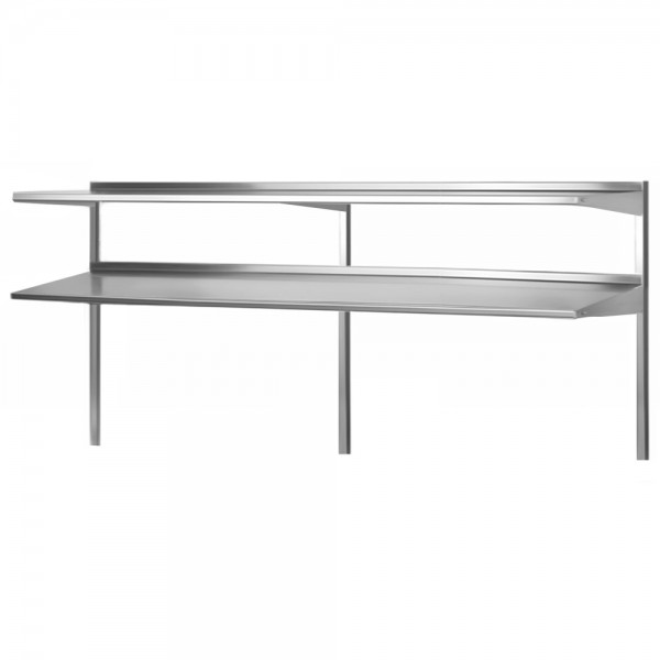 The sturdy double overshelf is constructed of high-quality stainless steel, making it ideal for long-term applications in harsh commercial environments. With two tiers of shelving, it offers ample storage space for prep tools, ingredients, or food pans, allowing for easy prioritizing and sorting of frequently used items. The pre-drilled mounting holes make installation quick and easy.