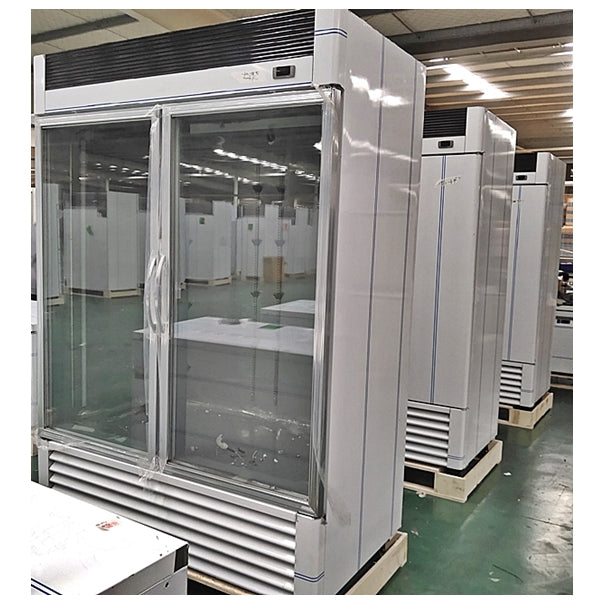 - 2 Glass Door Reach-in Freezer, Embraco Compressor Bottom Mounted, Dixell Controller, Ventilated, Adjustable caster, door with lock.