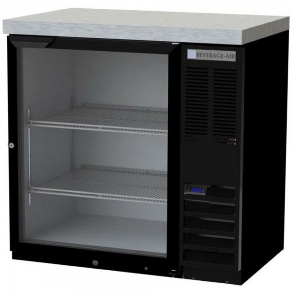 Beverage Air BB36HC-1-FG-B-27 36" Black Glass Swing Door Food Rated Back Bar Refrigerator with 2" Stainless Steel Top