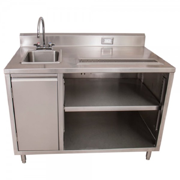 BK Resources, BEVT-3060L, Beverage Table, 60"W x 30"D, 14" x 10" sink on left with BKF-4DM-3G-G gooseneck faucet, 14 gauge stainless steel top, 18 gauge stainless steel body, built-in 24" urn trough with drain, (1) hinged door under sink, (1) adjustable shelf, 5" riser backsplash with standard electric outlet, stainless steel legs, NSF (3-10 day lead time)