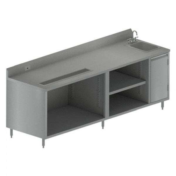 BK Resources, BEVT-3096R, Beverage Table, 96"W x 30"D, 14" x 10" sink on right with BKF-4DM-3G-G gooseneck faucet, 14 gauge stainless steel top, 18 gauge stainless steel body, built-in 38" urn trough with drain, (1) hinged door under sink, (2) undercounter compartments, one with adjustable shelf, 5" riser backsplash with standard electric outlet, stainless steel legs, NSF (3-10 day lead time)