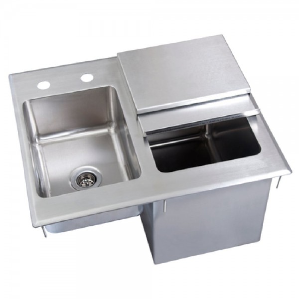 BK Resources, BK-DIBHL-2118, Drop-In Ice Bin, with sink, 21"W x 18"D OA, ice bin on right with 11" deep liner & removable sliding lid, 5-1/2" deep sink bowl with 4" OC deck mount faucet holes, includes BKDR-325CP & BKDR-2 drain, 304 stainless steel construction, 19-7/8" x 17" cutout recommended