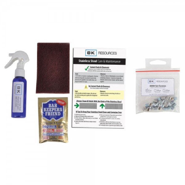 Introducing the BK Resources BK-SS-CAREKIT-SS Stainless Steel Cleaner Maintenance Mini Kit - the ultimate solution for keeping your stainless steel surfaces shining like new! With this mini kit, maintaining your stainless steel surfaces has never been easier. This kit includes a 3-ounce Bar Keepers Friend® Polish/Cleaner, a Scotch Brite™ pad, stainless steel kit instructions, and even includes the BK-SETSCREW-25.