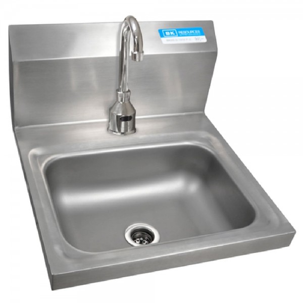 BK Resources, BKHS-D-1410-1-P-G, Hand Sink, wall mount, 14" wide x 10" front-to-back x 5" deep bowl, single hole deck mount with (1) BKF-DEF-3G Sensor Faucet, 1-7/8" basket drain with crumb cup, wall bracket included, 304 stainless steel, NSF
