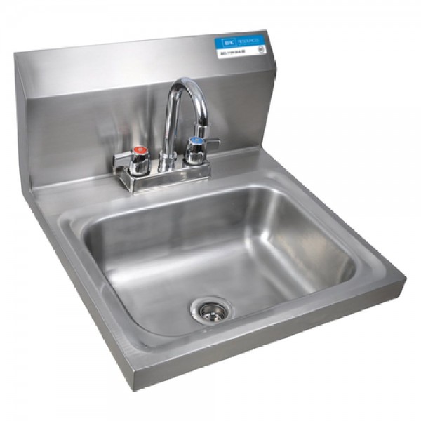 BK Resources, BKHS-D-1410-P-G, Hand Sink, wall mount, 14" wide x 10" front-to-back x 5" deep bowl, 4" O.C deck mount faucet (BKD-3G-G, lead free), marine edge, includes basket drain & wall mounting hardware, 304 stainless steel construction, NSF