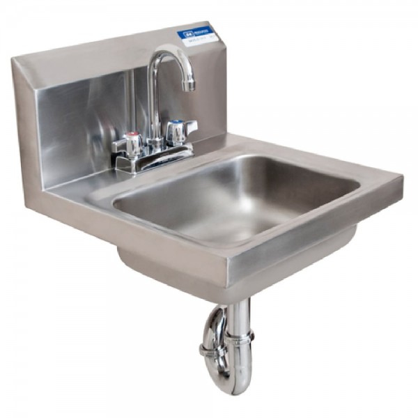 BK Resources, BKHS-D-1410-PT-G, Hand Sink, wall mount, 14" wide x 10" front-to-back x 5" deep bowl, 4" O.C. deck mount faucet holes with (1) BKD-3G-G faucet, P-trap, color coded hot & cold indicators, 1/4 turn ceramic cartridges, 1-7/8" basket drain with crumb cup, wall bracket included, 304 stainless steel, NSF