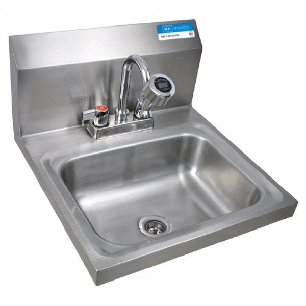 BK Resources, BKHS-D-1410-STPG, Hand Sink with Sanitimer Handwashing Timer, wall mounted, 14" wide x 10" front-to-back x 5" deep bowl size, 4" OC splash mount faucet holes with 3" gooseneck spout (BKF-W-3G-G), color coded hot & cold indicators, 1/4 turn ceramic cartridges, includes basket drain with crumb cup & wall bracket, 304 stainless steel, NSF (not available with wrist blade handles)