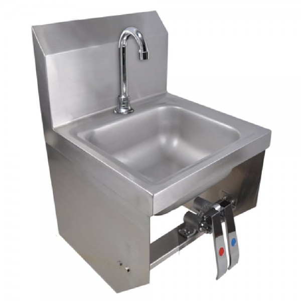 BK Resources, BKHS-D-SS-1-BKK-PG, Space Saver Hand Sink, wall mount, 9" wide x 9" front-to-back x 5" deep bowl, single deck mount 3-1/2" gooseneck spout faucet, dual knee valve pedals, 8"H backsplash, includes: drain, knee valve bracket, & wall mounting hardware, 304 stainless steel construction, NSF