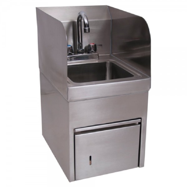 BK Resources, BKHS-D-SS-SKTS-P-G, Hand Sink, wall mount, 9" wide x 9" front-to-back x 5" deep bowl, 4" OC deck mount faucet (BKD-3G-G), integrated towel dispenser on front, side splashes on left & right, 8"H backsplash, includes basket drain (BKDR-2) & wall mounting hardware, 304 stainless steel construction, NSF