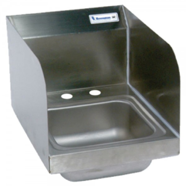 BK Resources, BKHS-D-SS-SS, Space Saver Hand Sink, wall mount, 9" wide x 9" front-to-back x 5" deep bowl, 4" OC deck mount faucet holes, marine edge, side splashes on left & right, 7-1/2"H backsplash, includes basket drain & wall mounting hardware, 304 stainless steel construction, NSF