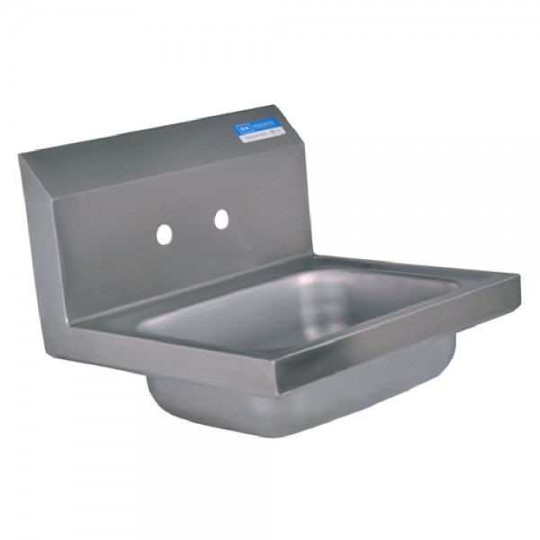 BK Resources, BKHS-W-1410-4D, Hand Sink, wall mount, 14" wide x 10" front-to-back x 5" deep bowl, 4" OC splash mount faucet holes, marine edge, 8-1/8" backsplash, includes 3-1/2" basket drain with crumb cup & wall mounting hardware, 304 stainless steel construction, NSF