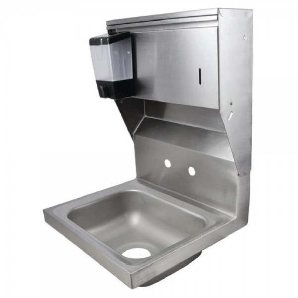 BK Resources, BKHS-W-1410-4D-TD, Hand Sink, wall mount, 14" wide x 10" front-to-back x 5" deep bowl, 4" OC splash mount faucet holes, marine edge, integral towel dispenser (accommodates BK-MFPT "C" fold towels), includes wall mounting hardware, 304 stainless steel construction, NSF