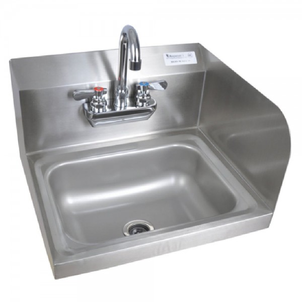 BK Resources, BKHS-W-1410-RS-P-G, Hand Sink, wall mount, 14" wide x 10" front-to-back x 5" deep bowl, 4" O.C splash mount faucet (BKF-W-3G-G, lead free), marine edge, side splash on right, includes basket drain & wall mounting hardware, 304 stainless steel construction, NSF