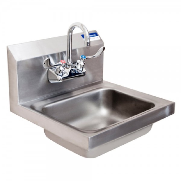 BK Resources, BKHS-W-1410-W-G, Hand Sink, wall mount, 14" wide x 10" front-to-back x 5" deep bowl, 4" O.C. splash mount faucet holes with (1) BKF-W-3G-G faucet, wrist blade handles, 1-7/8" drain opening, basket drain & mounting bracket included, 304 stainless steel, NSF
