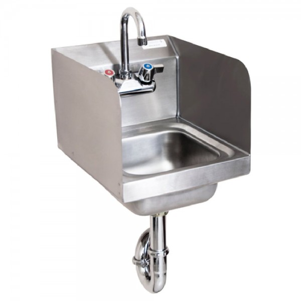 BK Resources, BKHS-W-SS-SS-PT-G, Space Saver Hand Sink, wall mount, 9" wide x 9" front-to-back x 5" deep bowl, 4" O.C. splash mount faucet holes with (1) BKF-W-3G-G faucet, side splashes on left & right, 1-7/8" drain opening, P-trap, basket drain & mounting bracket included, 304 stainless steel, NSF