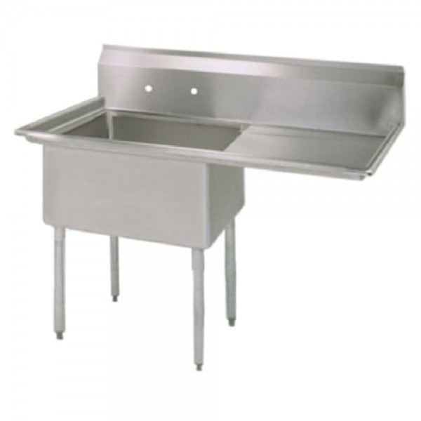 BK Resources, BKS-1-1620-12-18R, Sink, one compartment, 36-1/2"W x 25-13/16"D x 43-3/4"H overall size, 16" wide x 20" front-to-back x 12" deep compartment, 18" drainboard on right, 9"H backsplash, 8" OC splash mount faucet holes, 1-1/2" rolled edges on front & sides, includes basket drain (BKDR-4), 18/304 stainless steel construction, galvanized steel legs, adjustable high impact corrosion resistant feet, NSF