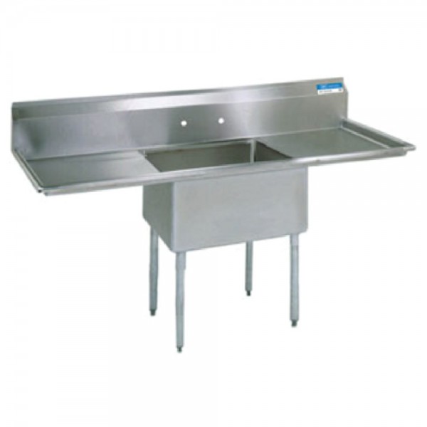 BK Resources, BKS-1-24-14-24T, Sink, one compartment, 72"W x 29-13/16"D x 43-3/4"H overall size, 24" wide x 24" front-to-back x 14" deep compartment, (2) left & right 24" drainboards, 9"H backsplash, 8" OC splash mount faucet holes, 1-1/2" rolled edges on front & sides, includes basket drain (BKDR-4), 18/304 stainless steel construction, galvanized steel legs, adjustable high impact corrosion resistant feet, NSF