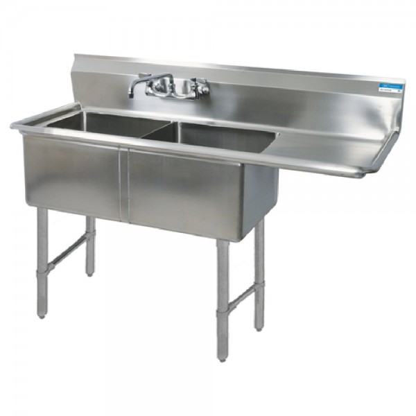 BK Resources, BKS-2-18-12-18RS, Sink, two compartment, 56-1/2"W x 23-13/16"D x 43-3/4"H overall size, 18” wide x 18” front-to-back x 12" deep compartments, 18" drainboard on right, 9"H backsplash, 8" OC splash mount faucet holes, 1-1/2" rolled edges front & sides, includes basket drains (BKDR-4), 18/304 stainless steel construction, stainless steel legs & side crossbracing, adjustable stainless steel over plastic bullet feet, NSF