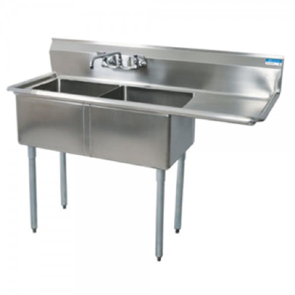 Introducing the BK Resources BKS-2-24-14-24R Sink Two Compartment, the perfect solution for all your commercial kitchen needs. With an overall size of 74-1/2"W x 29-13/16"D x 43-3/4"H, this sink is designed to accommodate even the busiest kitchens. Featuring two spacious compartments measuring 24” wide x 24” front-to-back x 14" deep each, this sink provides ample space for all your washing needs. The 24" drainboard on the right side of the sink allows for easy drying and added convenience.
