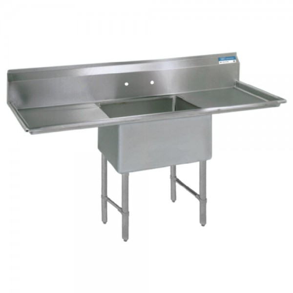 BK Resources, BKS6-1-18-14-18TS, Sink, one compartment, 57-1/4"W x 23-1/2"D x 44-1/16"H overall size, 18” wide x 18” front-to-back x 14” deep compartment, (2) left & right 18" drainboards, 10"H backsplash, 8” OC splash mount faucet holes, 1-1/2” rounded front & side edges, includes basket drain, 16/304 stainless steel deck & bowl, stainless steel legs & side bracing, adjustable stainless steel over plastic bullet feet, NSF