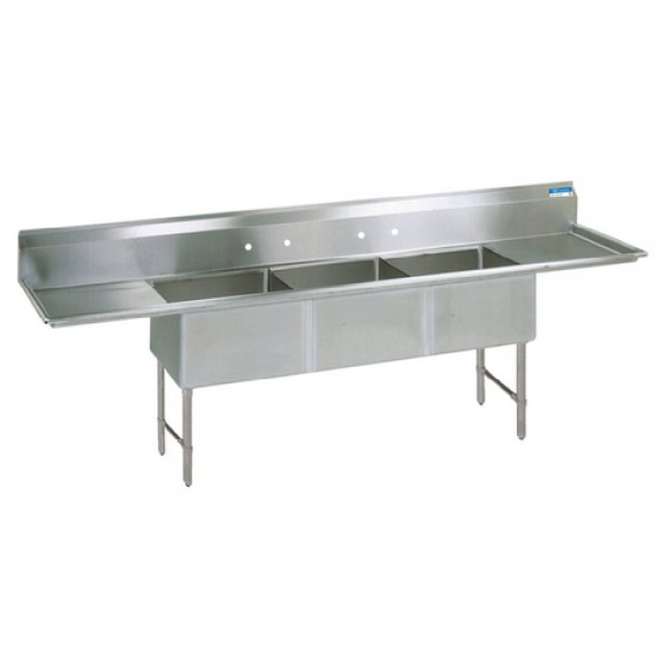 Introducing the BK Resources BKS6-3-24-14-24TS Sink, the perfect solution for your kitchen needs. This three-compartment sink boasts an overall size of 123-1/4"W x 29-1/2"D x 44-1/16"H, providing ample space for all your dishwashing needs. Each compartment measures 24” wide x 24” front-to-back x 14” deep, with a 10"H backsplash to prevent any water splashes. The sink comes with two left and right 24" drainboards, allowing you to drain dishes and utensils easily.