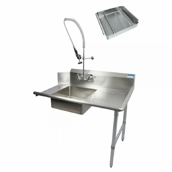 The 20" x 20" x 8" deep pre-rinse sink comes equipped with an 8" OC splash mount pre-rinse faucet (BKF-SMPR-WB-G) that makes cleaning dishes a breeze. The 10"H backsplash and raised rolled edges on the front and sides keep your kitchen space neat and tidy. This dishtable comes with a pre-rinse basket (BK-PRB-5) and a basket drain (BKDR-4) for added convenience. The galvanized legs and side bracing provide a sturdy foundation, while the high impact corrosion-resistant adjustable bullet feet ensure stability on any surface.