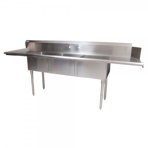 BK Resources, BKSDT-3-20-12-20LS, Soiled Dishtable, & Three-Compartment Sink, 100"W x 30-1/2"D x 44"H overall size, left-to-right operation, (3) 20" wide x 20" front-to-back x 12" deep compartments, 10"H backsplash, 8" OC splash mount faucet holes, includes: (3) BKDR-4 basket drains, (2) BK-SDTS tray guides & (1) BK-PRB-5 pre-rinse basket, 18/304 stainless steel top, 1-5/8" rolled edges on front & sides, stainless steel legs & side bracing, stainless steel over plastic adjustable bullet feet, NSF