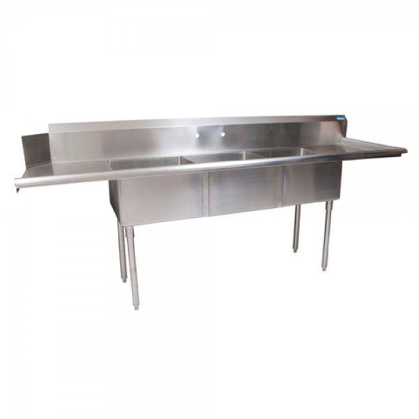 Constructed with durable 18/304 stainless steel, the top boasts 1-5/8" rolled edges on the front and sides for added strength and stability. The sink also features a 10"H backsplash, ensuring that any water or debris stays contained within the sink area. The BKSDT-3-20-12-20RSPG comes complete with all the necessary components, including a BKF-SMPR-WB-G pre-rinse assembly, three BK-LWR-1 lever drains, three BKDR-4 basket drains, two BK-SDTS tray guides, and one BK-PRB-5 pre-rinse basket.