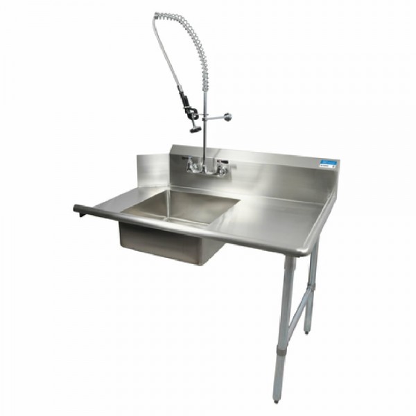 Crafted from high-quality 18/304 stainless steel, this dishtable features a spacious 20" x 20" x 8" deep pre-rinse sink and an 8" OC splash mount pre-rinse faucet (BKF-SMPR-WB-G) that helps to efficiently remove food debris and other contaminants from your dishes. The 10" high backsplash and raised rolled edges on the front and sides of the table provide extra protection against spills and splashes, keeping your kitchen clean and hygienic.