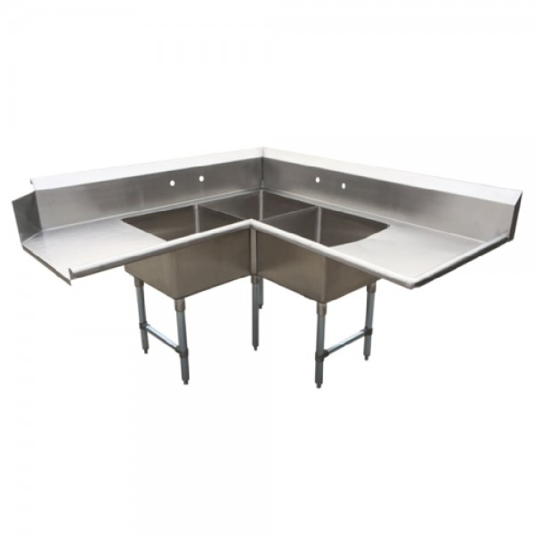 BK Resources, BKSDT-CO3-2012-LS, Soiled Dishtable, corner design, three compartment, 65-3/4"W x 67-1/4"D x 44"H overall size, left-to-right operation, 20" wide x 20" front-to-back x 12" deep compartments, 10"H backsplash, (2) sets of 8" OC splash mount faucet holes, includes: (3) BKDR-4 basket drains, (2) BK-SDTS tray guides & (1) BK-PRB-5 pre-rinse basket, 18/304 stainless steel top, stainless steel legs & side bracing, NSF