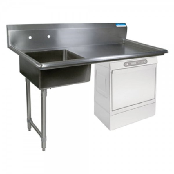 BK Resources, BKUCDT-50-L-SS, Soiled Dishtable, undercounter, 50"W x 30"D x 46"H, left-to-right operation, 18/304 stainless steel top, 20" x 20" x 8" deep pre-rinse sink, 8" OC splash mount faucet holes, 10"H backsplash, raised rolled edges on front & sides, includes basket drain (BKDR-4), stainless steel legs & side bracing, stainless steel over plastic adjustable bullet feet, NSF