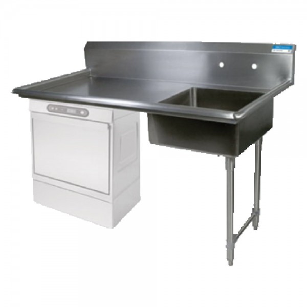 BK Resources, BKUCDT-50-R-SS, Soiled Dishtable, undercounter, 50"W x 30"D x 46"H, right-to-left operation, 18/304 stainless steel top, 20" x 20" x 8" deep pre-rinse sink, 8" OC splash mount faucet holes, 10"H backsplash, raised rolled edges on front & sides, includes basket drain (BKDR-4), stainless steel legs & side bracing, stainless steel over plastic adjustable bullet feet, NSF