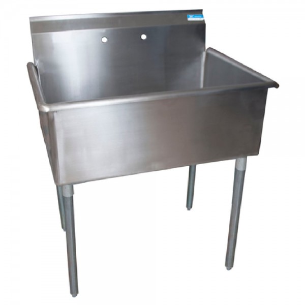 BK Resources, BKUS6-1-3624-14, Utility Sink, one compartment, 39"W x 27-1/2"D x 41-1/4"H overall size, 36" wide x 24" front-to-back x 14" deep compartment, 9"H backsplash, 8” OC splash mount faucet holes, 1-1/2" rounded front & side edges, 16/430 stainless steel deck & bowl, galvanized legs, adjustable high impact corrosion resistant feet, NSF