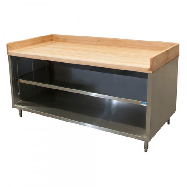 BK Resources, CMBT-3072, Chef Table, cabinet base with open front, 72"W x 30"D x 39"H overall size, 1-3/4" thick hard maple bakers top with 4" coved riser on back and sides, 18/304 stainless steel body, enclosed with stainless steel panels on sides and rear, 6” stainless steel legs with 1" height adjustment, stainless steel feet, NSF