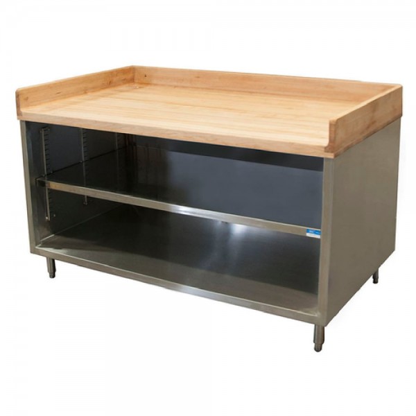 BK Resources, CMBT-3648, Chef Table, cabinet base with open front, 48"W x 36"D x 39"H overall size, 1-3/4" thick Hard Maple Bakers Top with 4" coved riser on back and sides, 18/304 stainless steel body, enclosed with stainless steel panels on sides and rear, 6” stainless steel legs with 1" height adjustment, stainless steel feet, NSF