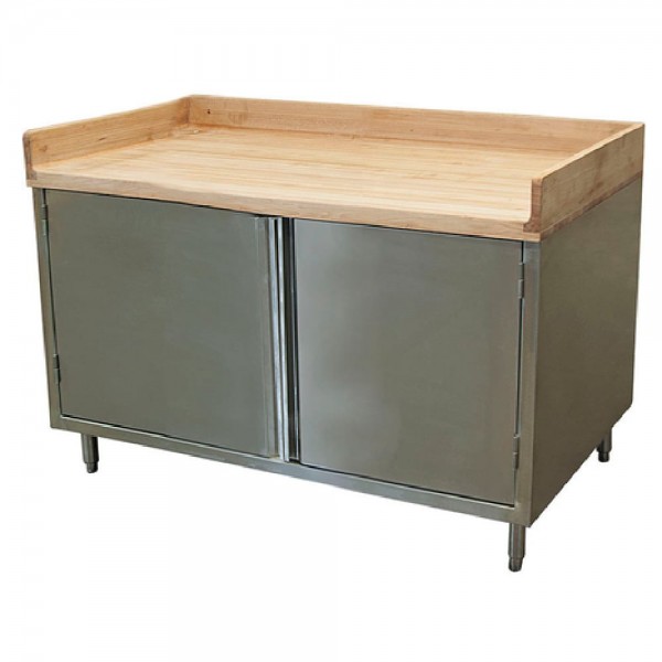 BK Resources, CMBT-3648H, Chef Table, cabinet base with hinged doors, 48"W x 36"D x 39"H overall size, 1-3/4" thick Hard Maple Bakers Top with 4" coved riser on back and sides, 18/304 stainless steel body, (1) set of hinged doors, enclosed with stainless steel panels on sides and rear, 6” stainless steel legs with 1" height adjustment, stainless steel feet, NSF (3-10 day lead time)