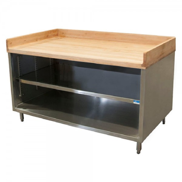 BK Resources, CMBT-3660, Chef Table, cabinet base with open front, 60"W x 36"D x 39"H overall size, 1-3/4" thick Hard Maple Bakers Top with 4" coved riser on back and sides, 18/304 stainless steel body, enclosed with stainless steel panels on sides and rear, 6” stainless steel legs with 1" height adjustment, stainless steel feet, NSF