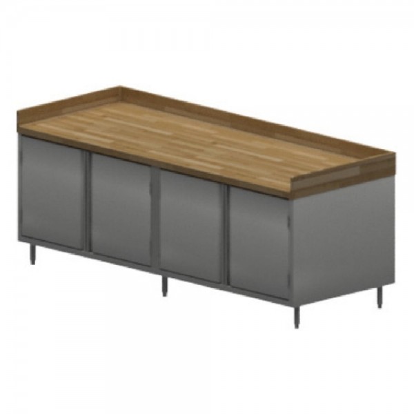BK Resources, CMBT-3696H, Chef Table, cabinet base with hinged doors, 96"W x 36"D x 39"H overall size, 1-3/4" thick Hard Maple Bakers Top with 4" coved riser on back and sides, 18/304 stainless steel body, center mullion, (2) sets of hinged doors, enclosed with stainless steel panels on sides and rear, 6” stainless steel legs with 1" height adjustment, stainless steel feet, NSF (3-10 day lead time)